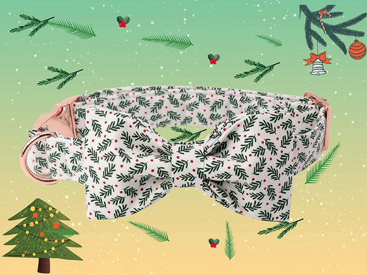Christmas Holly Dog Collar with Bowtie, Small Adjustable 12"-16" Neck, Holiday Collar for Small Dogs